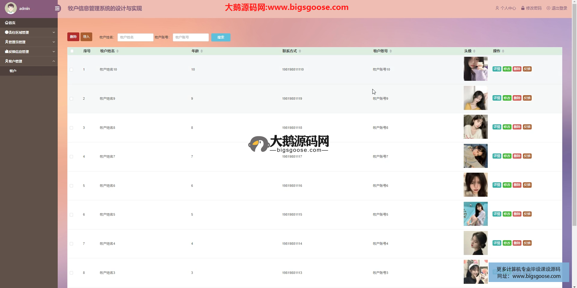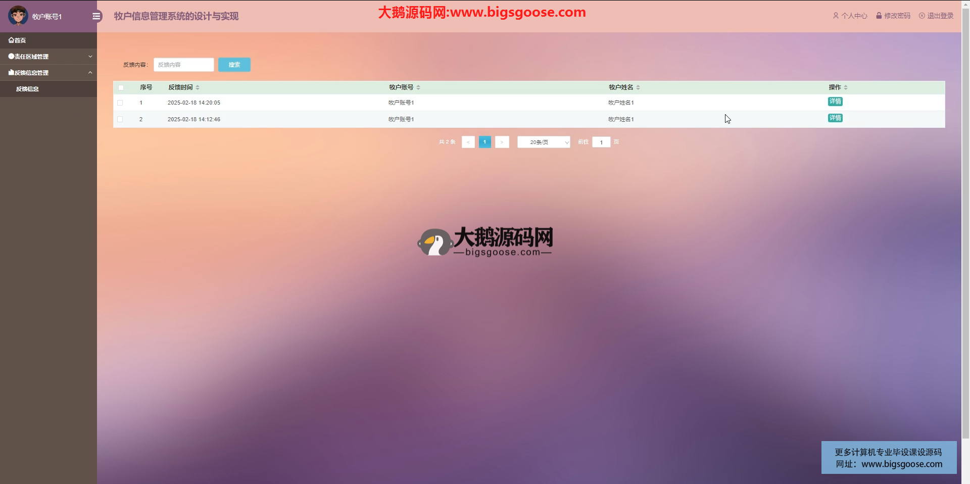 基于SpringBoot框架实现的牧户信息管理系统,本项目适合作为计算机毕业设计、java毕业设计、微信小程序毕业设计、课程设计、大作业等参考和学习,另外本站承接计算机毕设项目开发、毕业论文辅导、论文修改、降重润色、程序讲解、答辩辅导、开题定题等毕业一条龙服务,包原创、包通过!欢迎咨询~