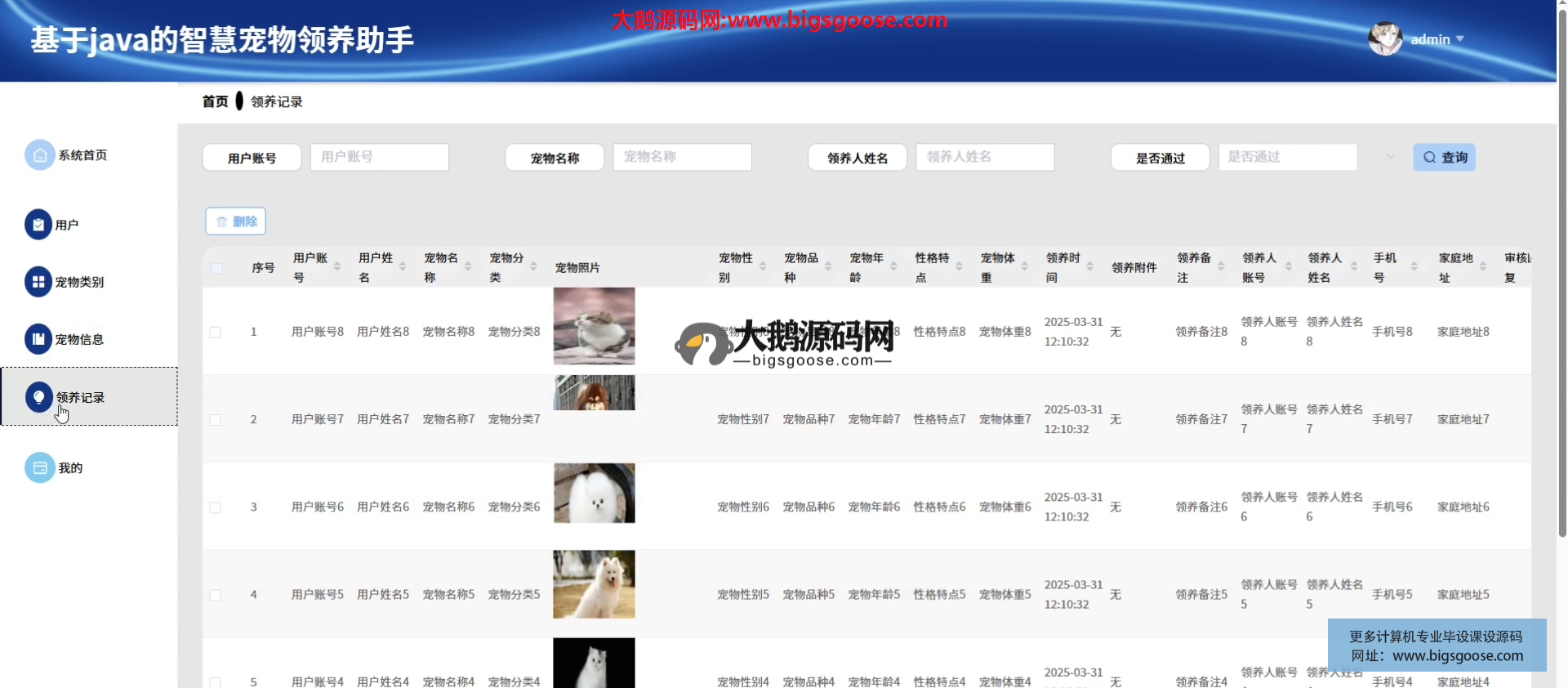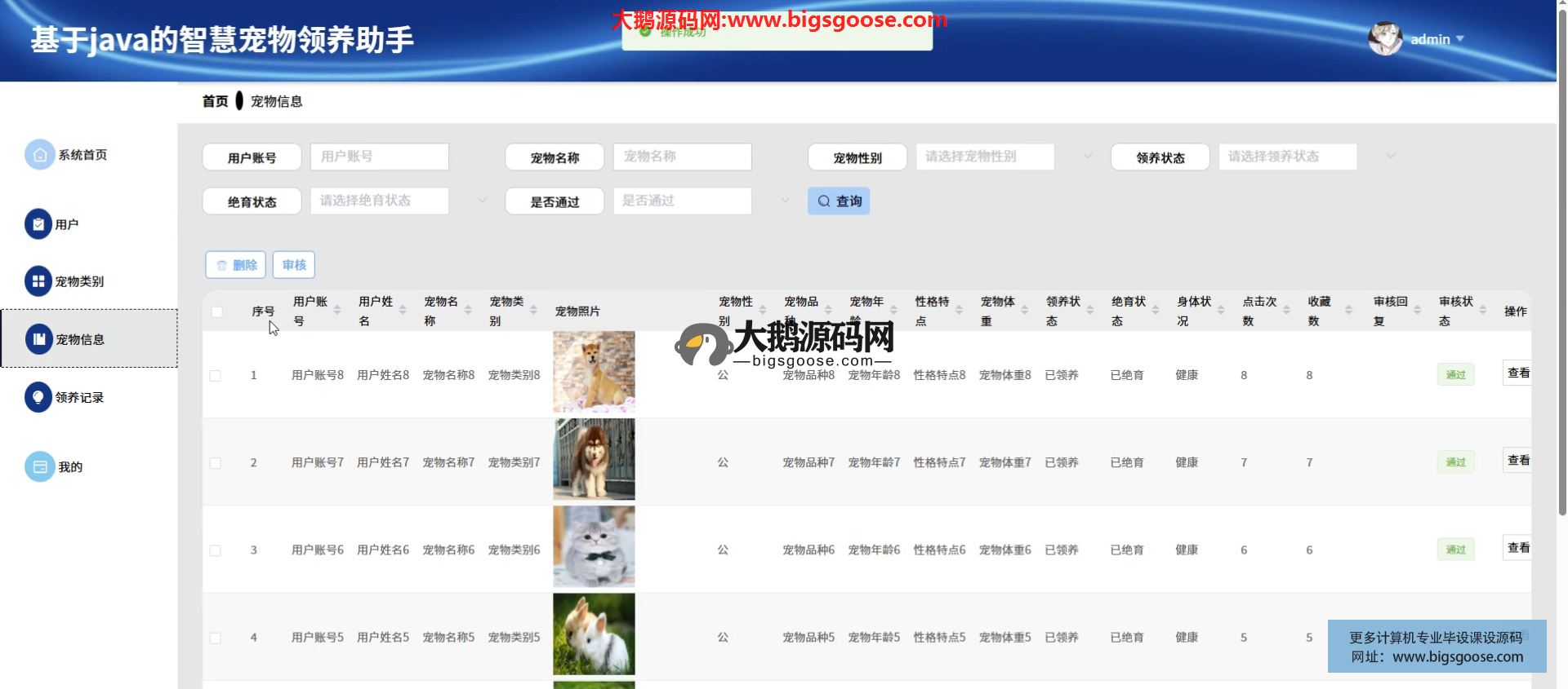 “智慧宠物领养助手”整合城市救助站与认证家庭资源,通过AI画像精准匹配宠物与主人,用户可在线浏览、留言、跟踪领养进度;管理员全流程监管,确保领养透明、安全、可追溯,让每一次相遇都成为终身陪伴。