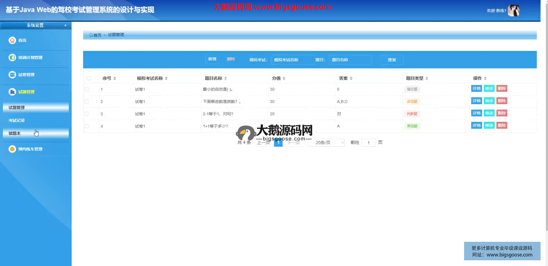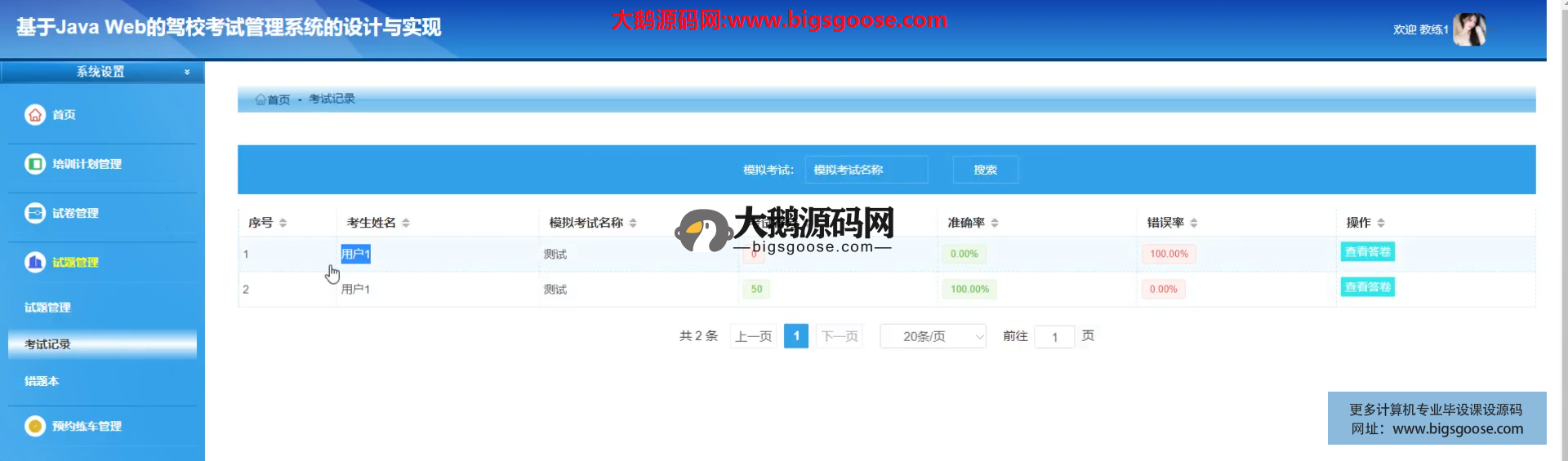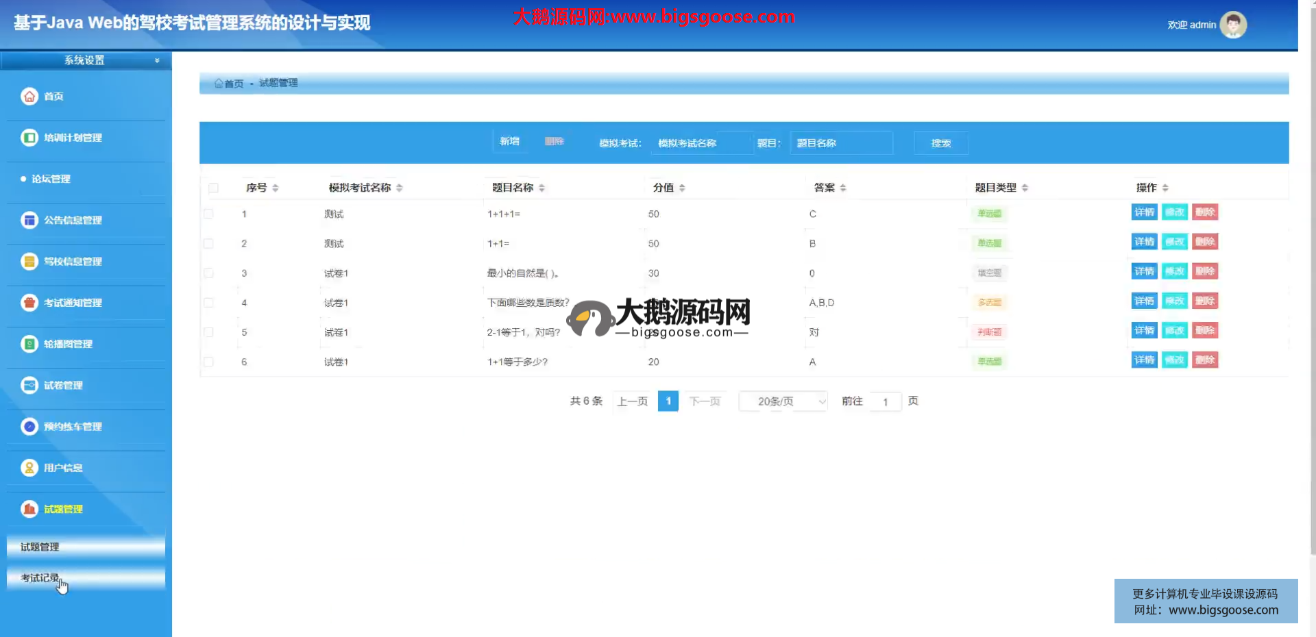 模拟考试管理:设置考试时间、合格线,查看学员成绩与错题分布