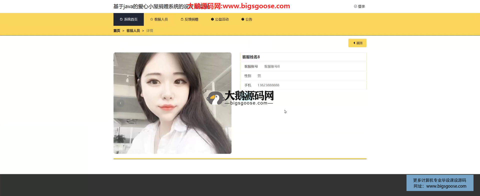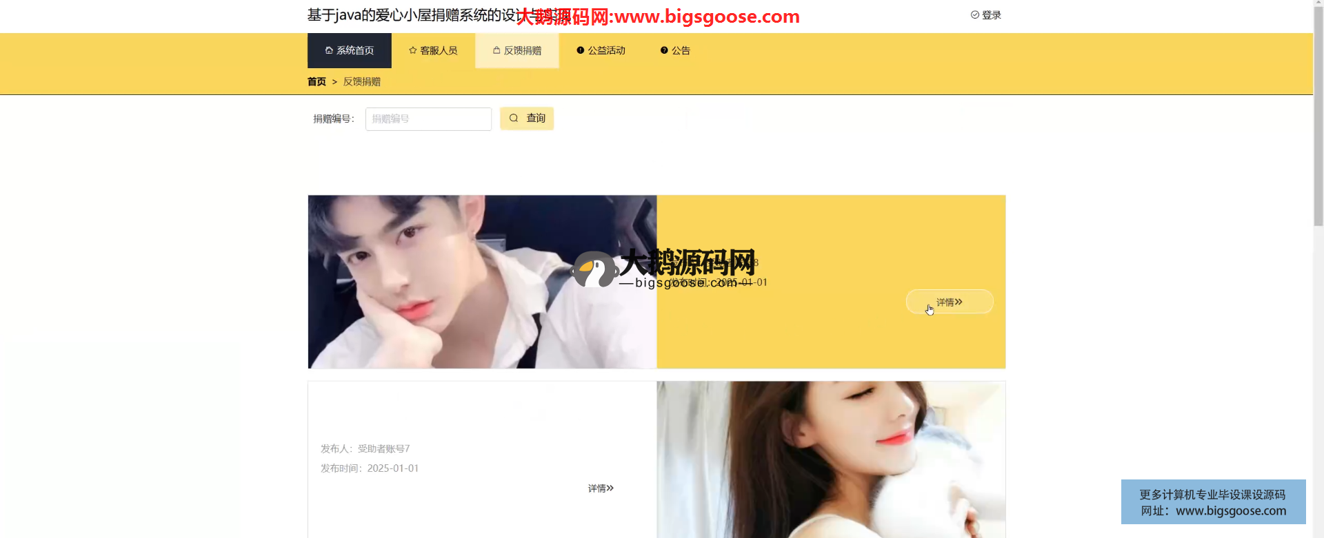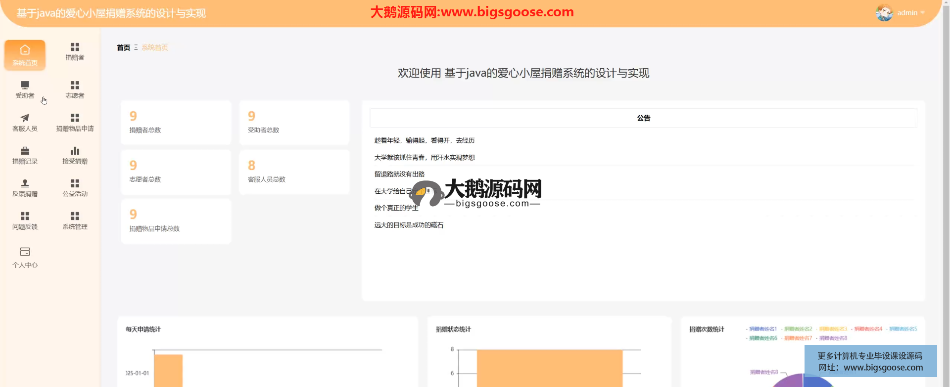 基于SpringBoot框架实现的爱心小屋捐赠系统,本项目适合作为计算机毕业设计、java毕业设计、微信小程序毕业设计、课程设计、大作业等参考和学习,另外本站承接计算机毕设项目开发、毕业论文辅导、论文修改、降重润色、程序讲解、答辩辅导、开题定题等毕业一条龙服务,包原创、包通过!欢迎咨询~