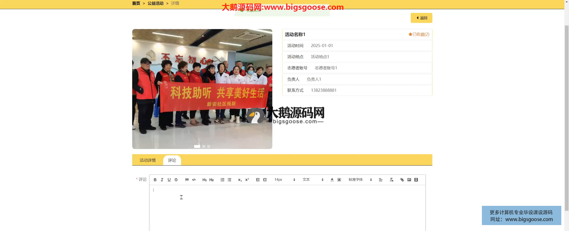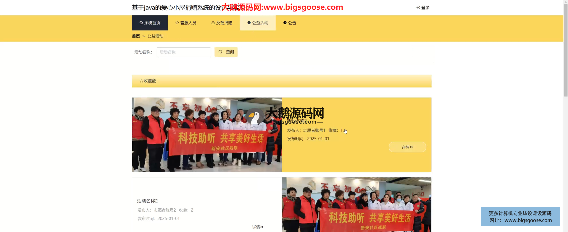 公益活动管理:创建、更新、下线活动,管理报名与现场签到统计。
