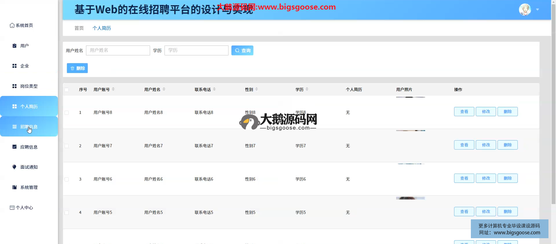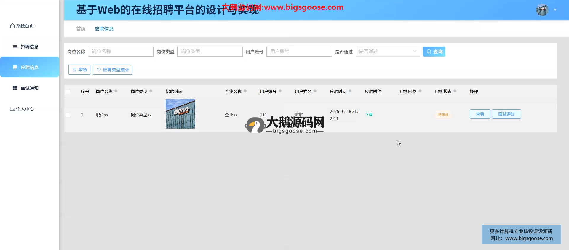 应聘信息管理:简历按岗位聚合,标记通过/淘汰,支持导出与备注
