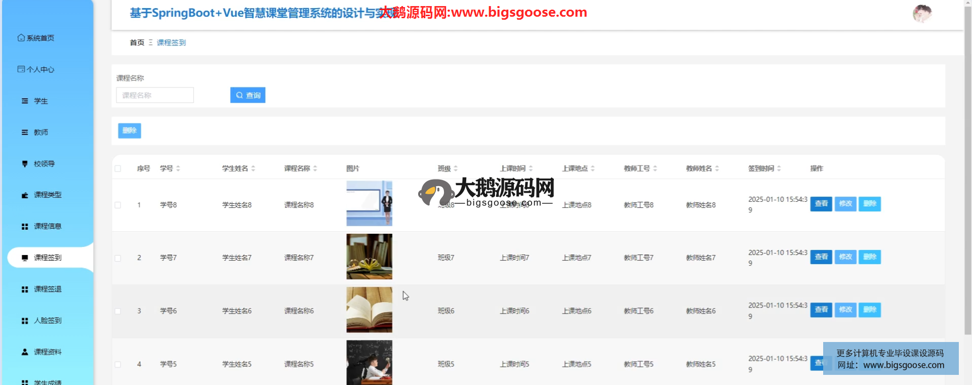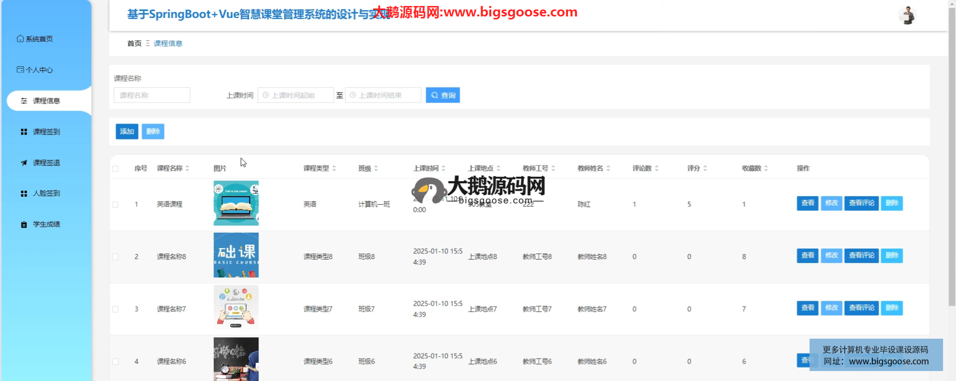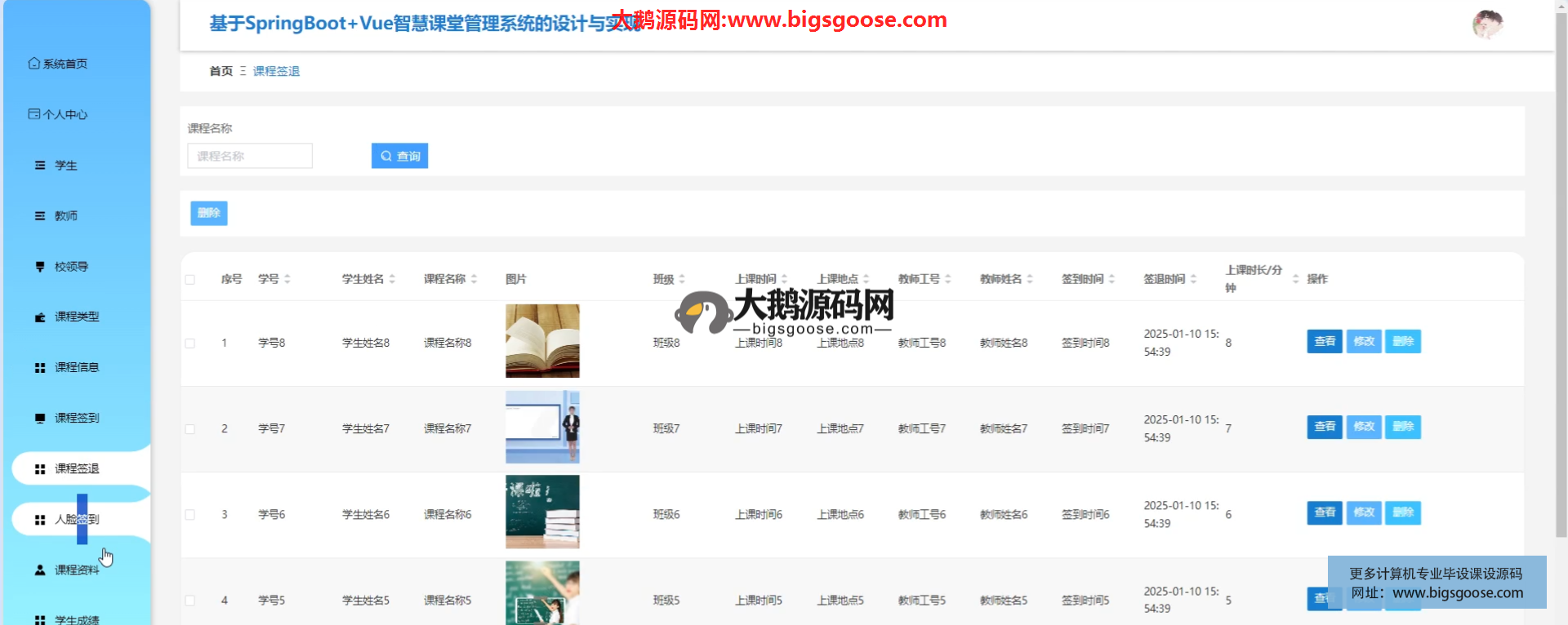 课程信息管理:查看全校课程列表,支持按学院、学期筛选
