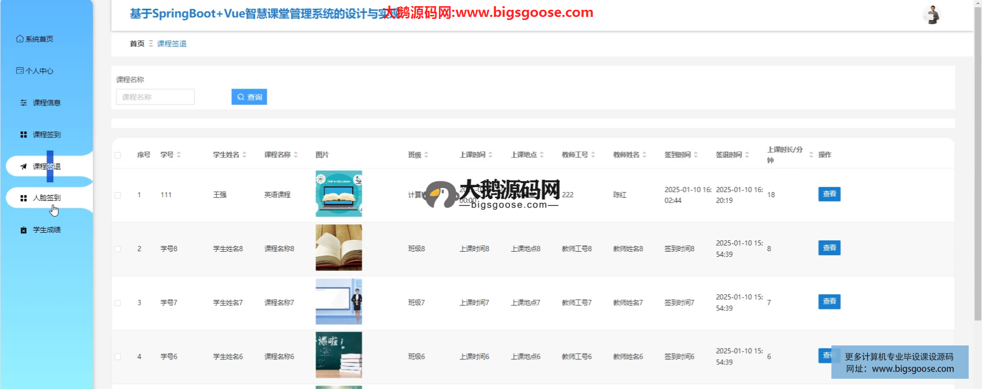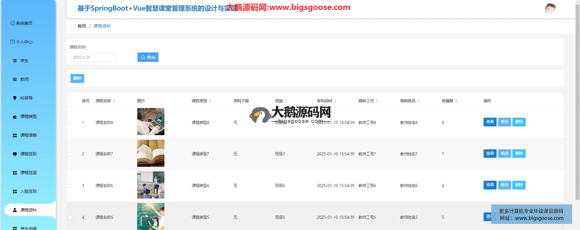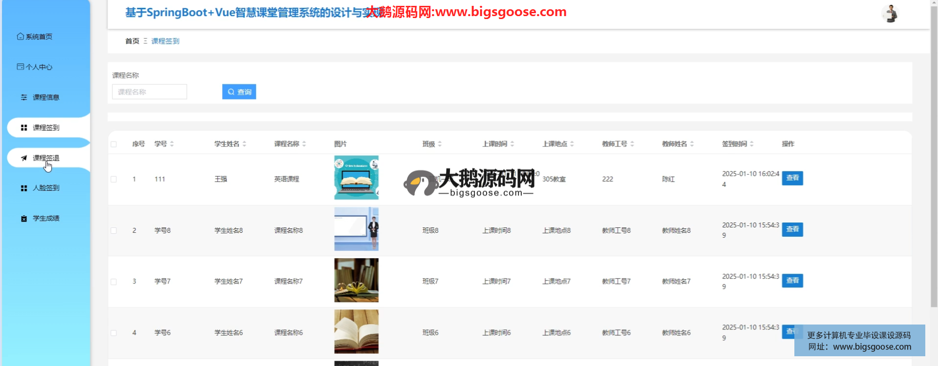 课程信息管理:查看全校课程列表,支持按学院、学期筛选