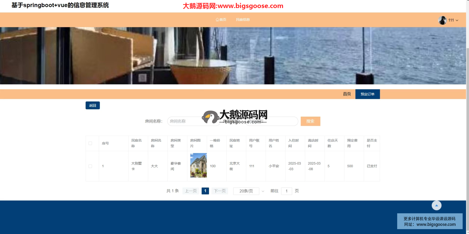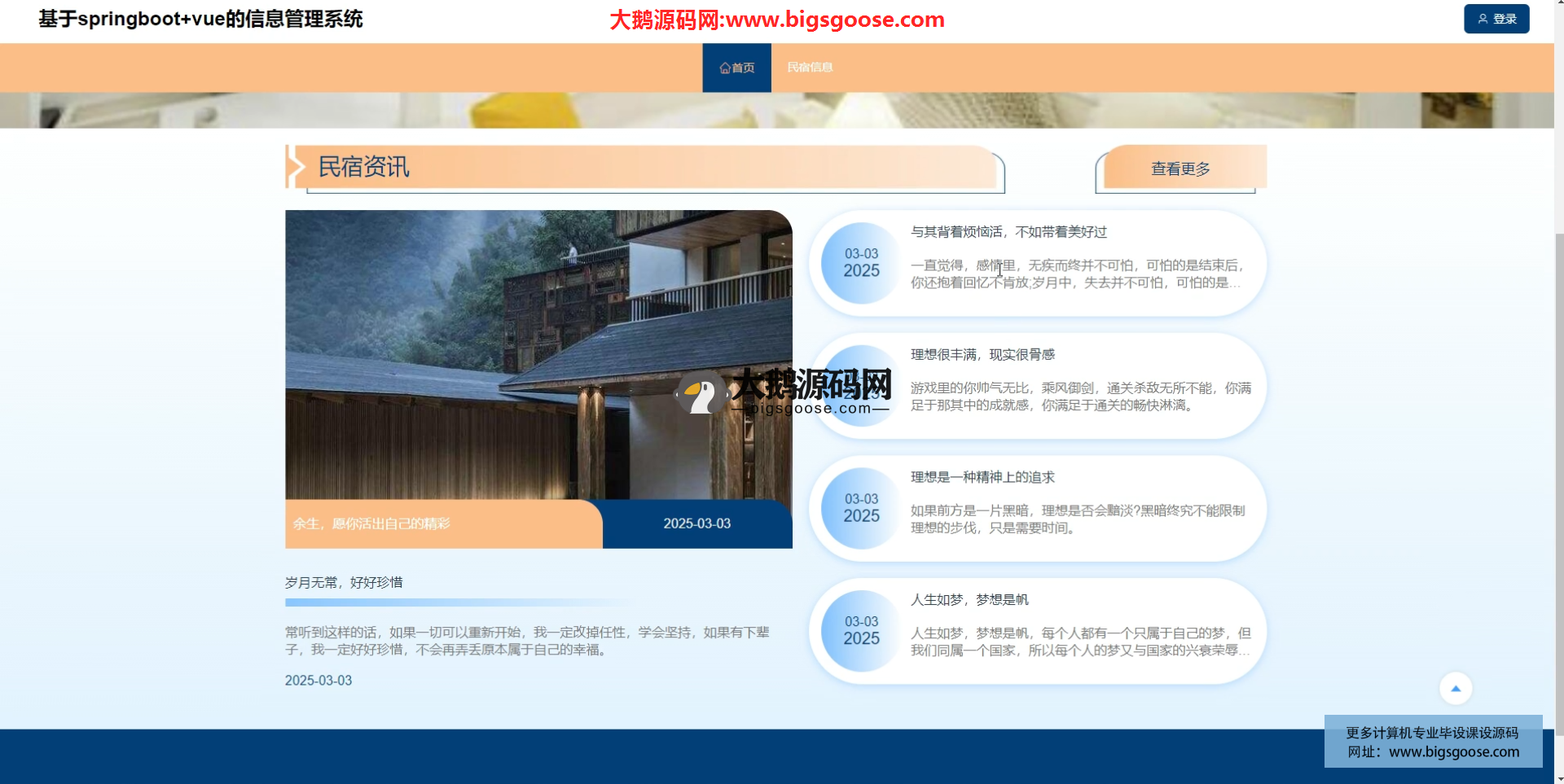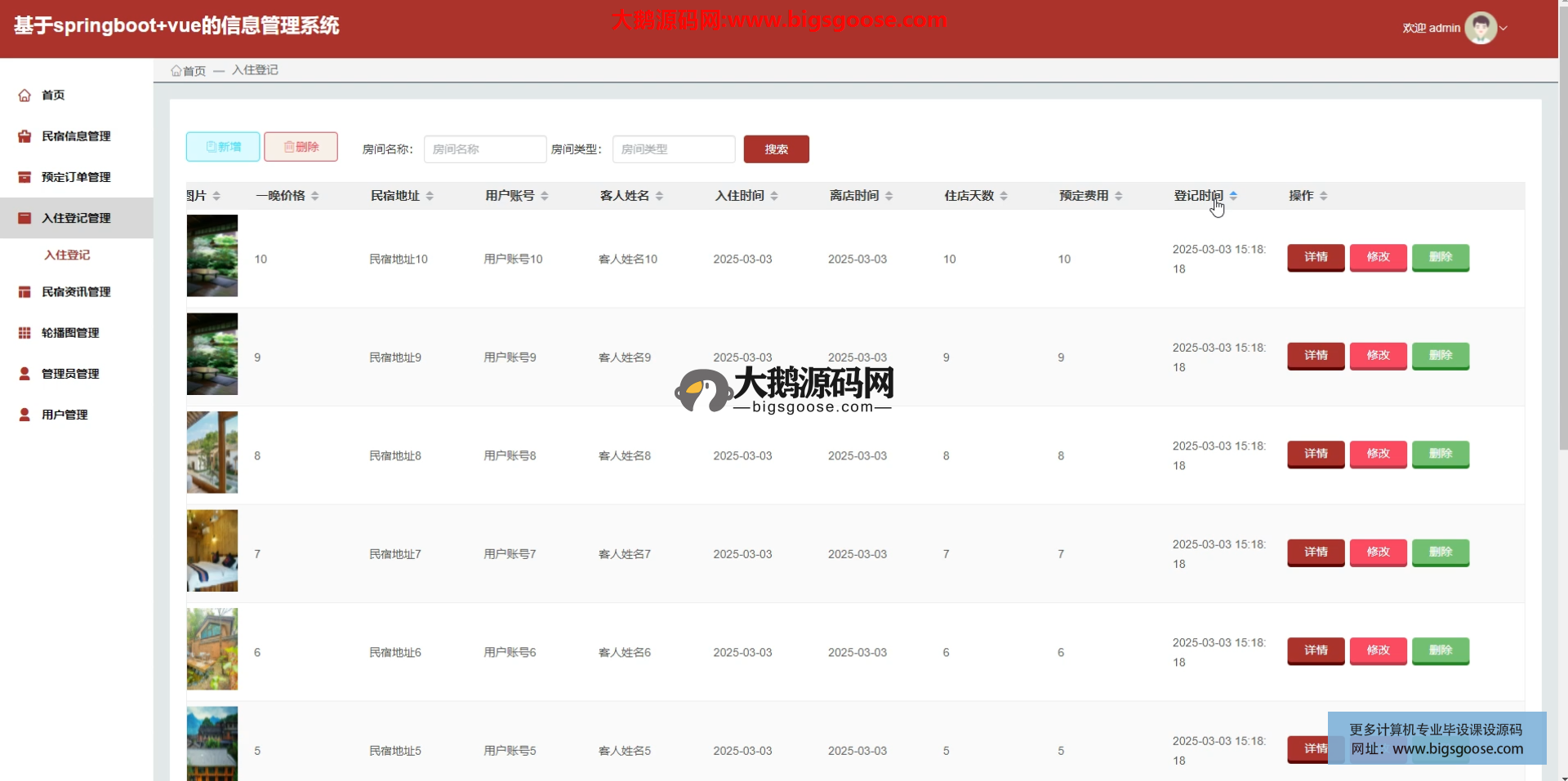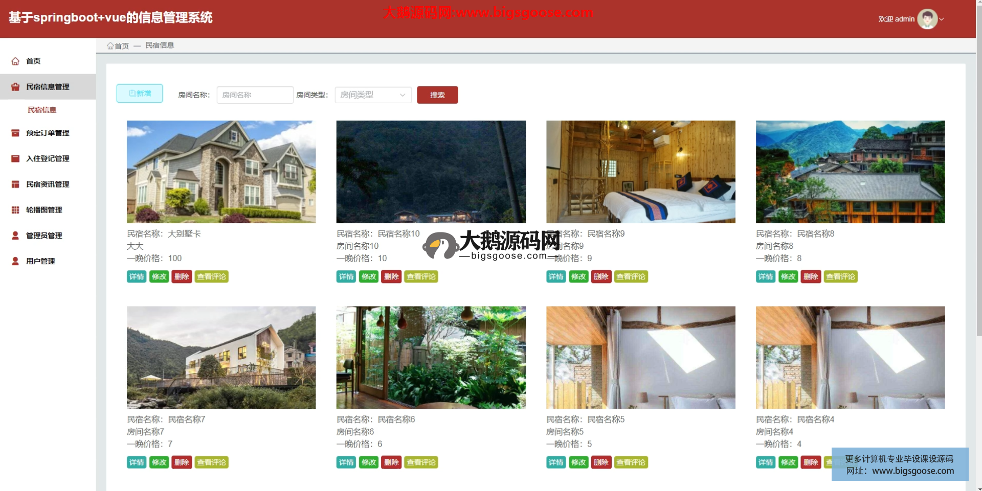 “信息管理系统”面向民宿运营场景,为游客提供资讯浏览、房型搜索与在线订房功能;管理员后台集中管理用户、民宿、订单及入住登记,实现民宿业务数据化、流程标准化、服务高效化。