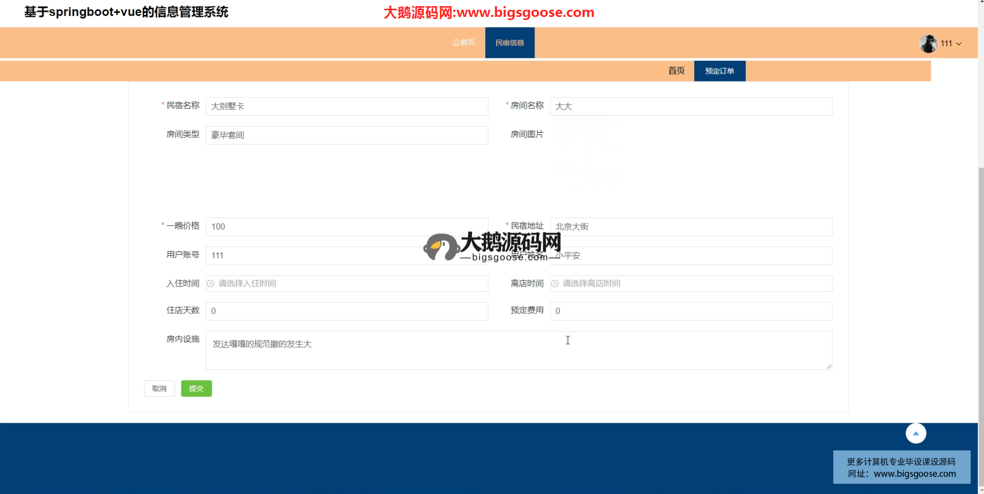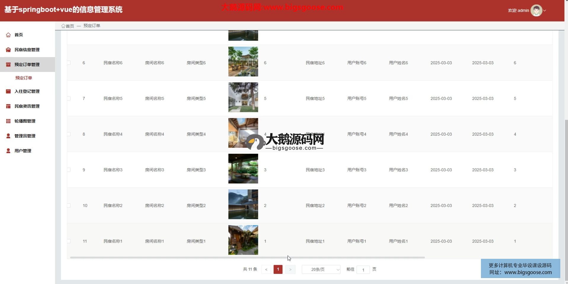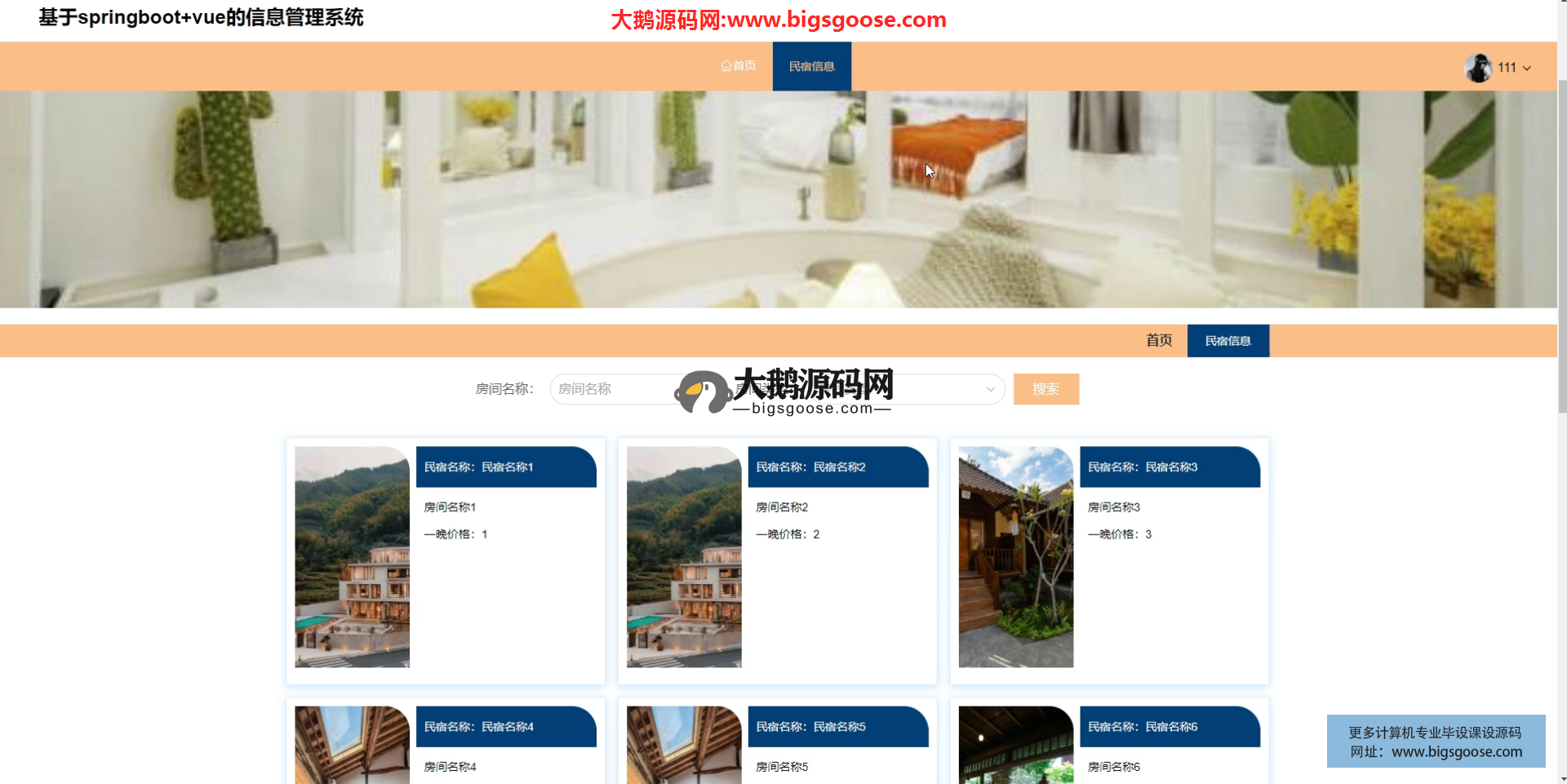 “信息管理系统”面向民宿运营场景,为游客提供资讯浏览、房型搜索与在线订房功能;管理员后台集中管理用户、民宿、订单及入住登记,实现民宿业务数据化、流程标准化、服务高效化。