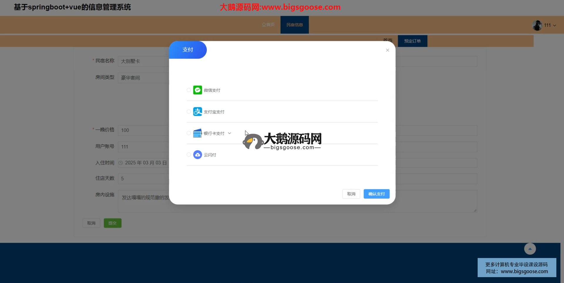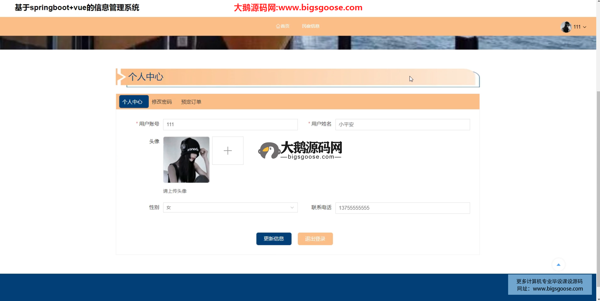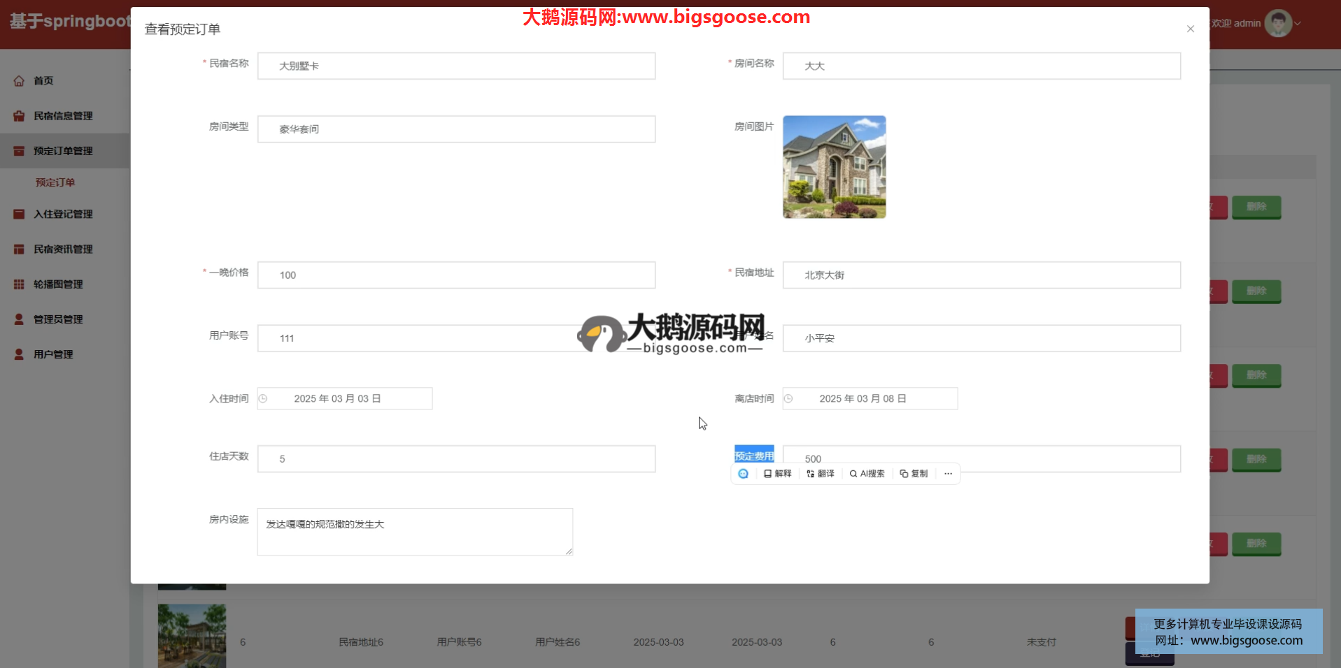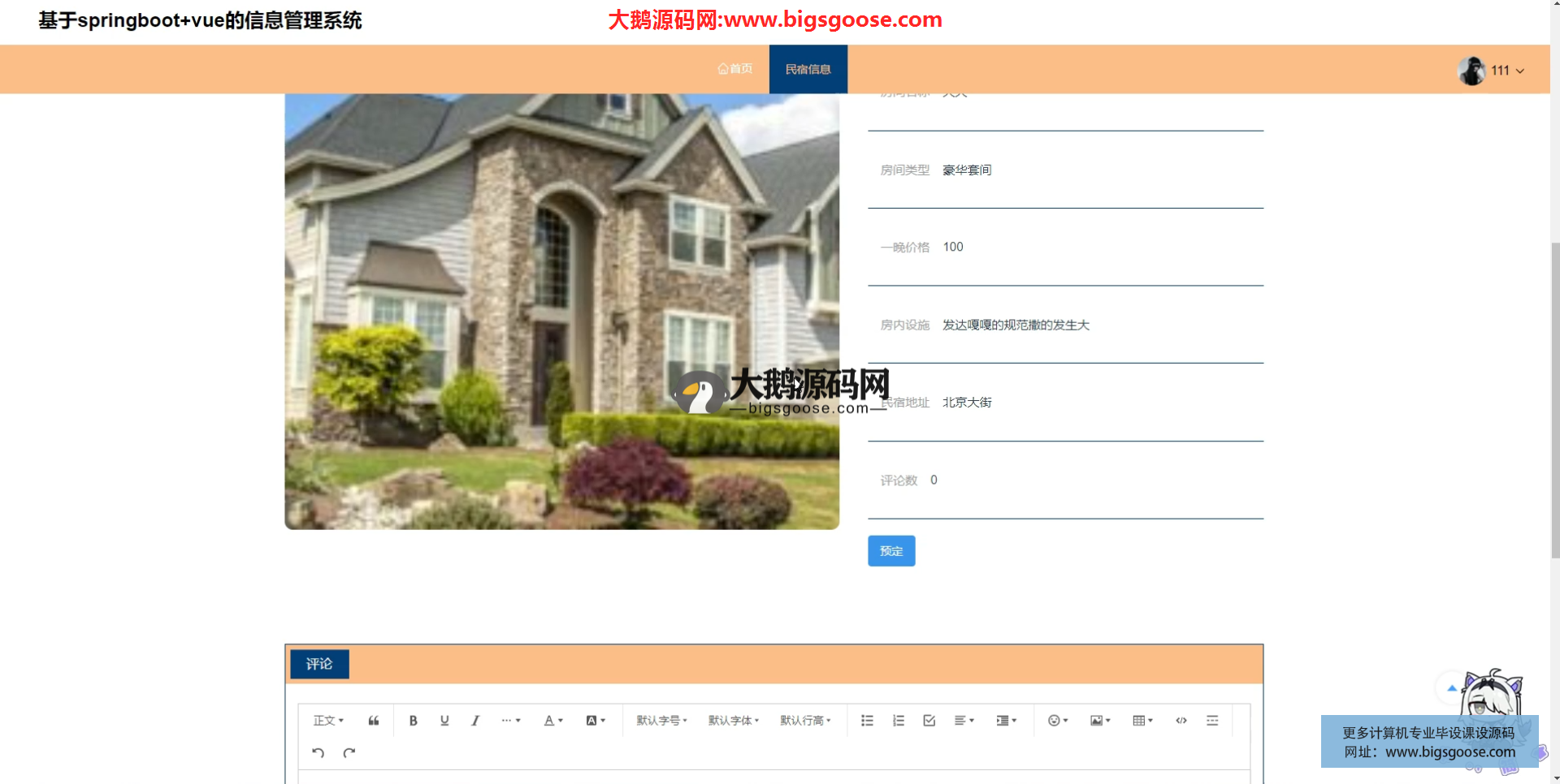 “信息管理系统”面向民宿运营场景,为游客提供资讯浏览、房型搜索与在线订房功能;管理员后台集中管理用户、民宿、订单及入住登记,实现民宿业务数据化、流程标准化、服务高效化。