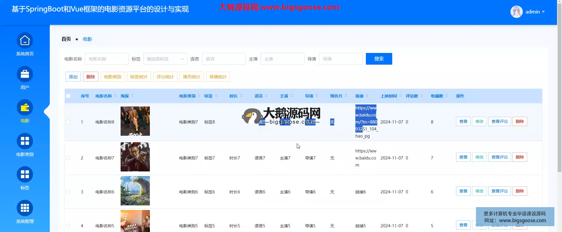 “电影资源平台系统”聚合海量片源与资讯,用户可按类别、标签快速发现影片、参与评分讨论;管理员后台统筹内容、用户与评论,实现电影资源一站式展示与社区化运营。