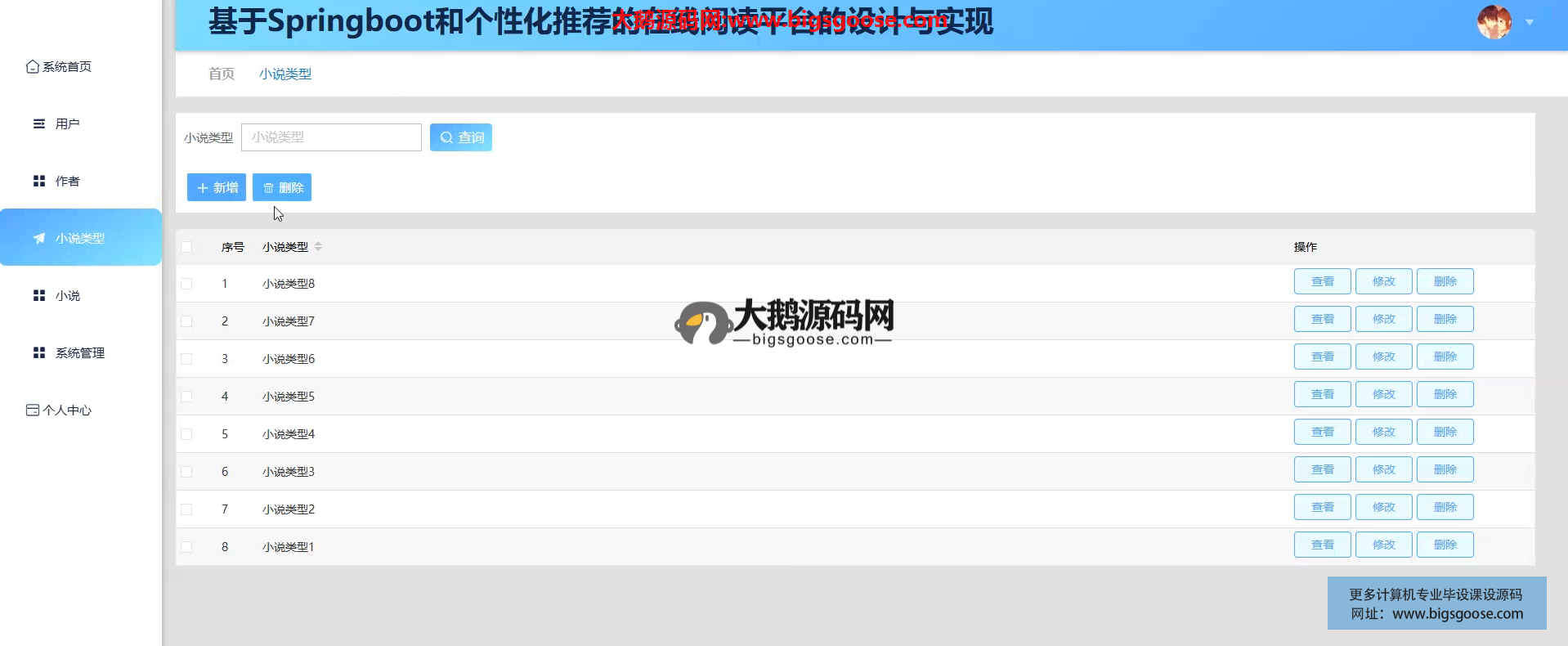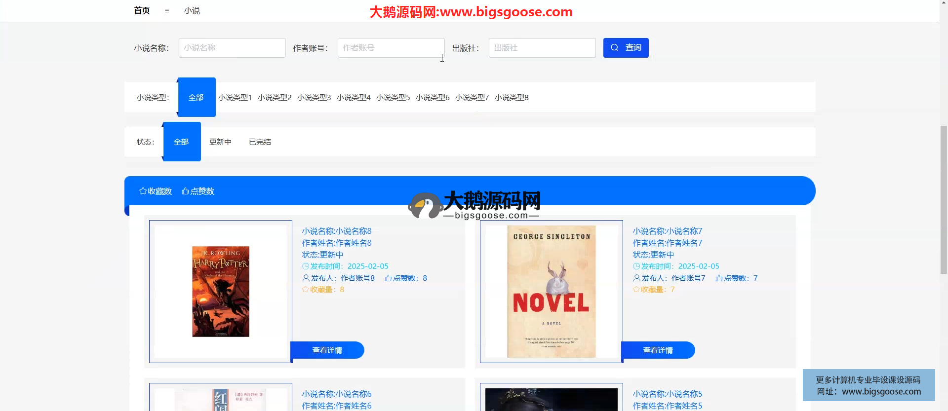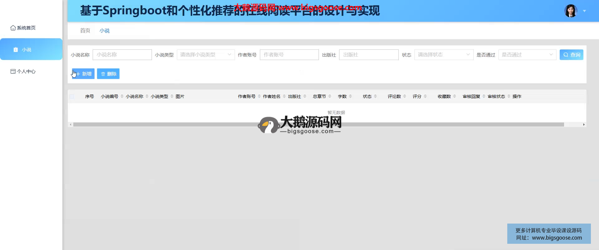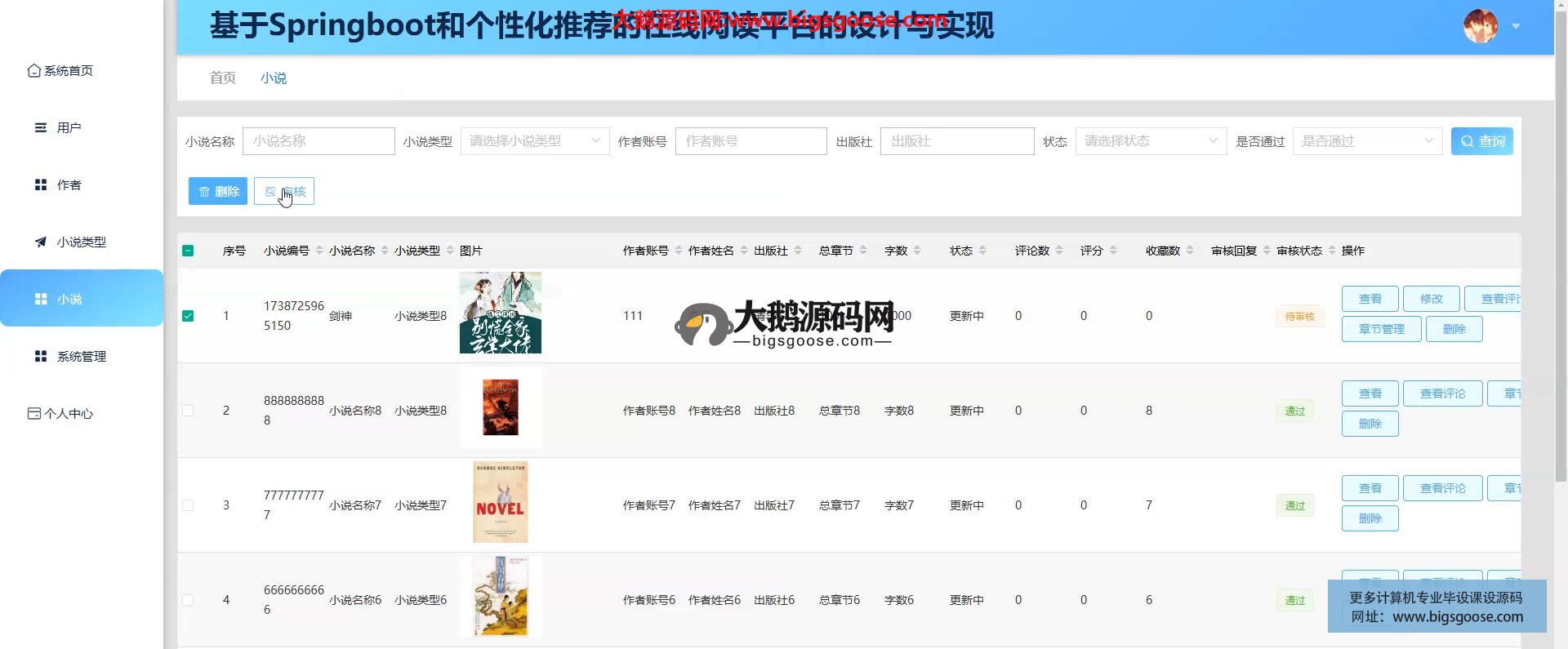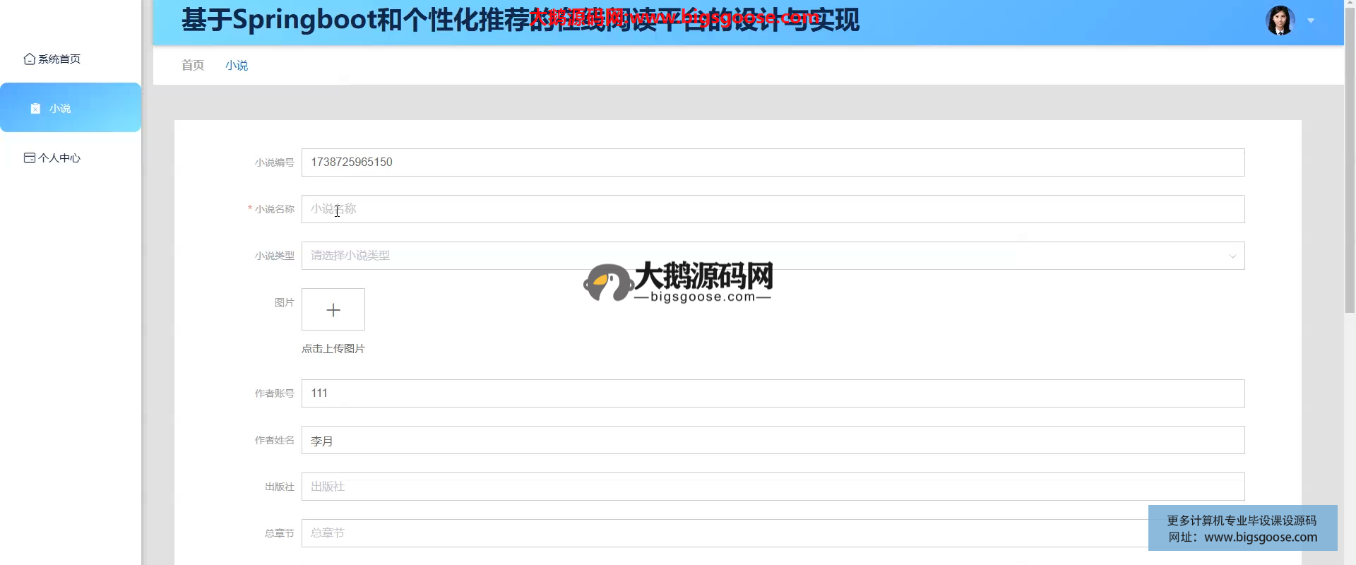 平台基于 Spring Boot 构建,融合个性化推荐引擎,为读者提供精准小说推送;作者自助上传管理作品,管理员统一监管内容与用户,实现“阅读-创作-运营”一体化数字出版生态。
