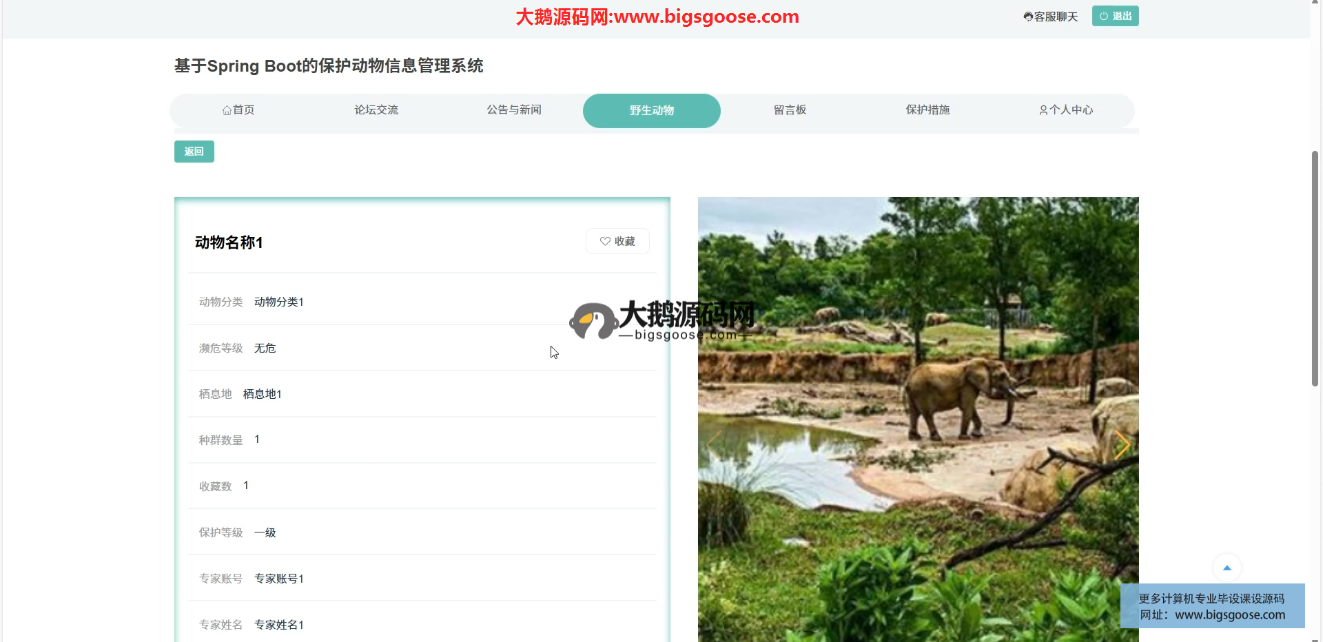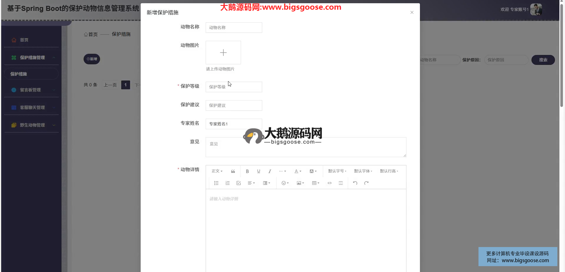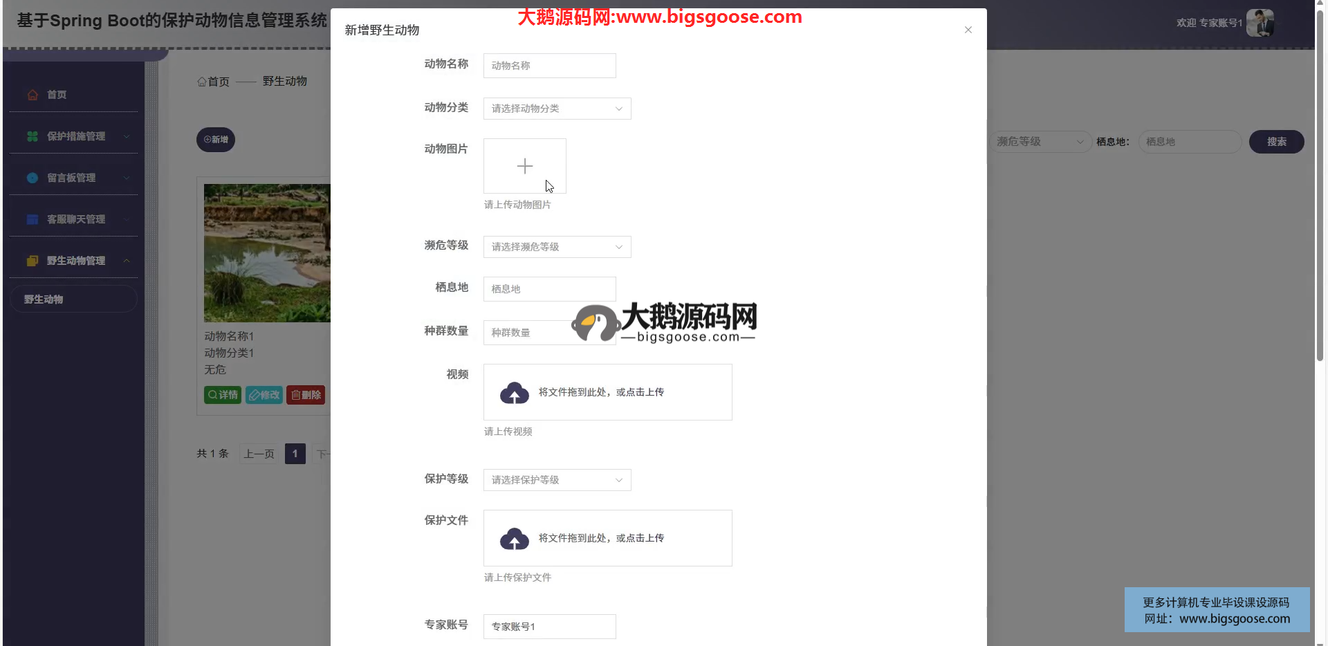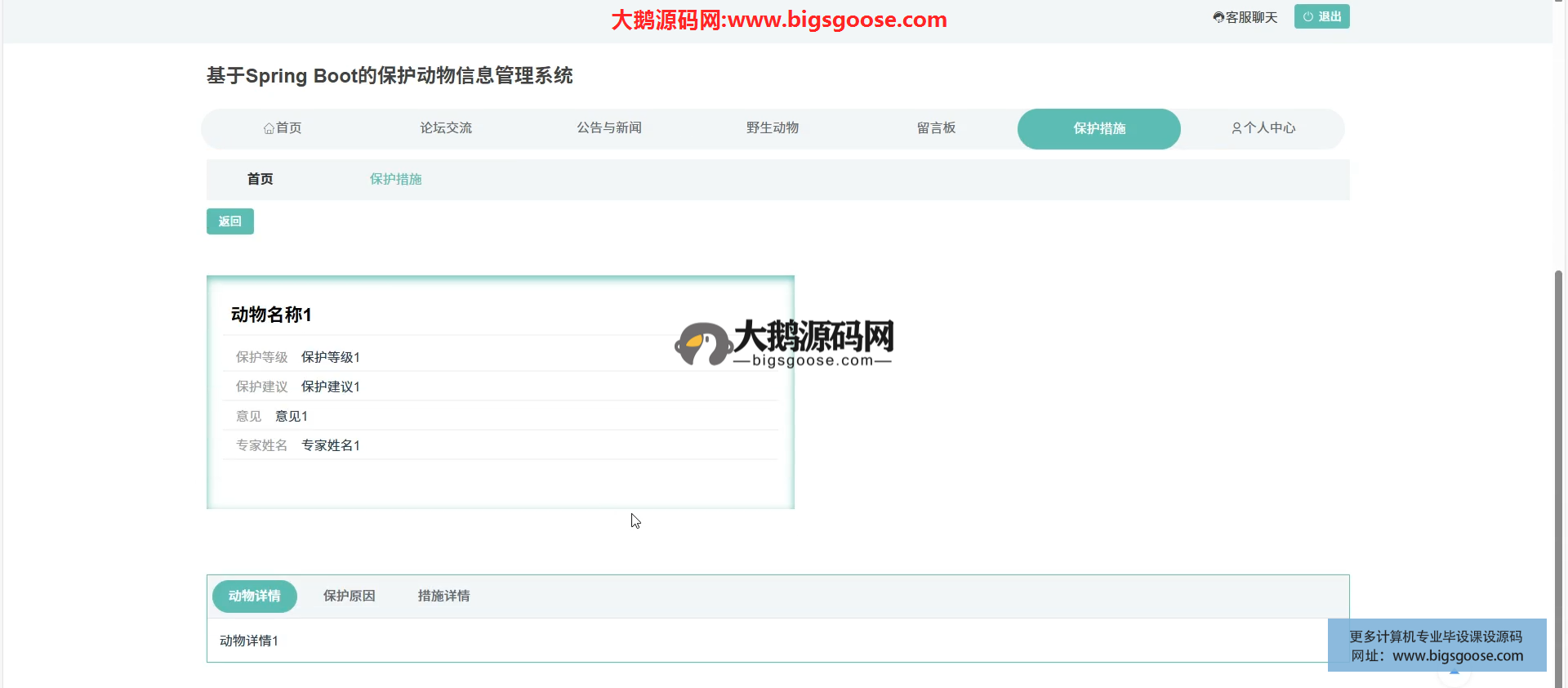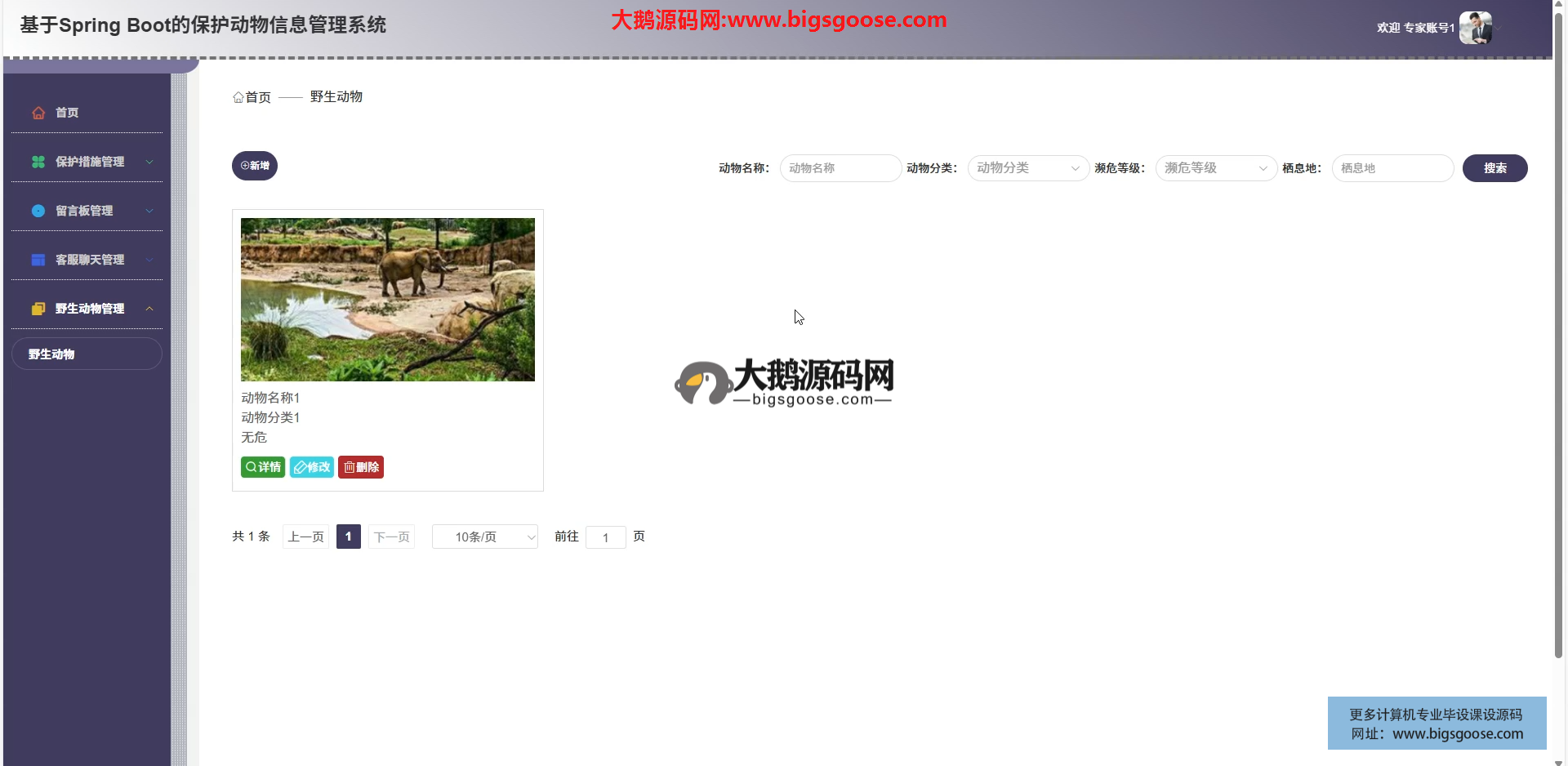 “保护动物信息管理系统”面向公众、专家与运营方,集中展示野生动物资料与保护举措;用户可浏览、留言、获取科普,专家在线维护内容与答疑,管理员统筹人员、论坛与系统,实现保护信息的权威发布与互动共享。