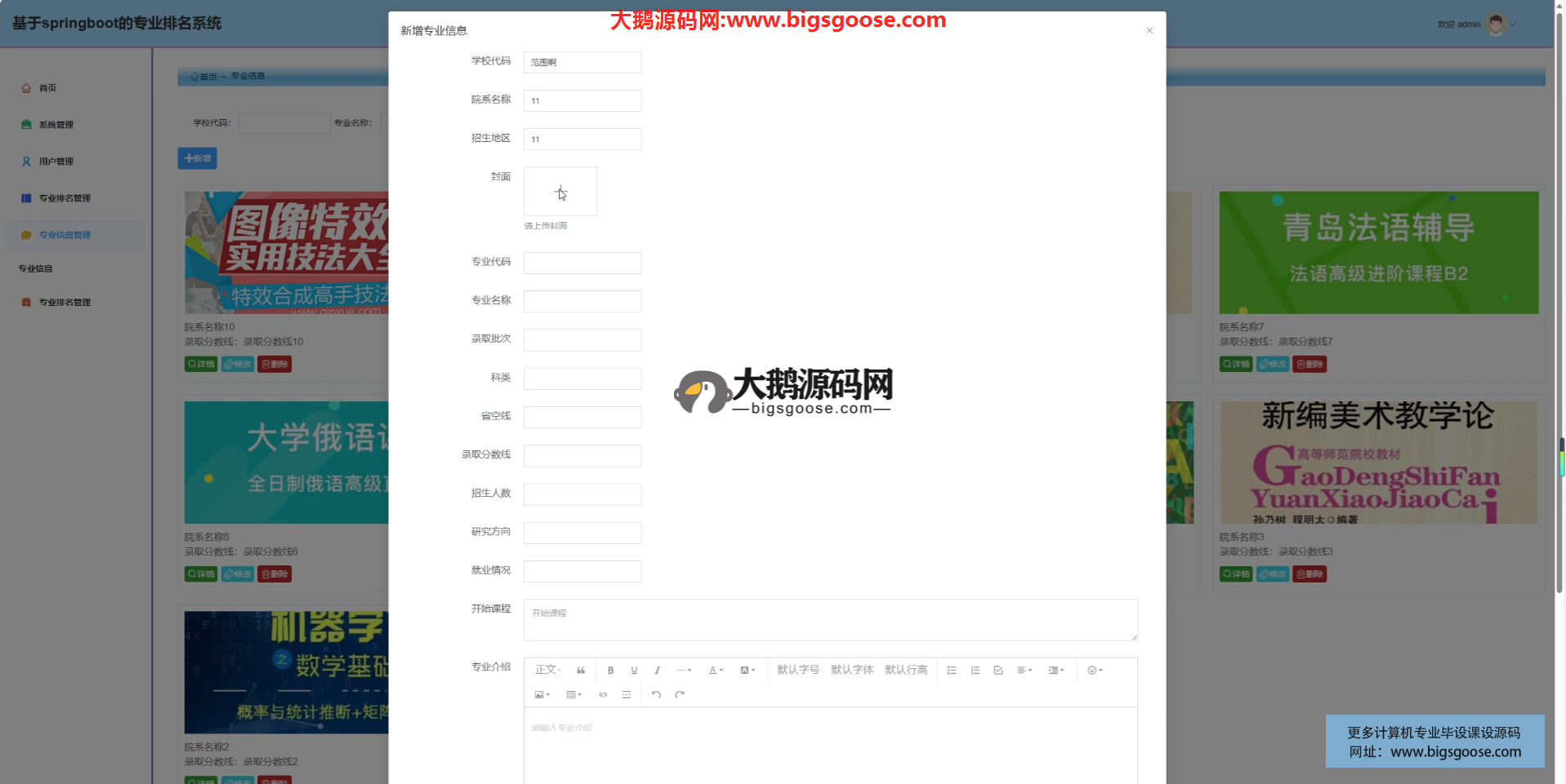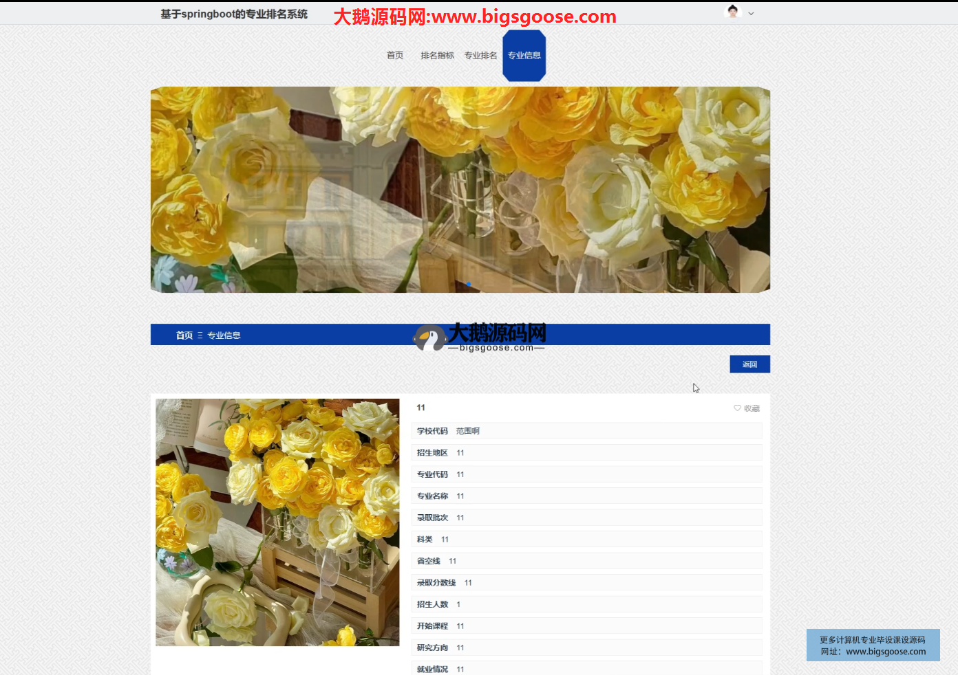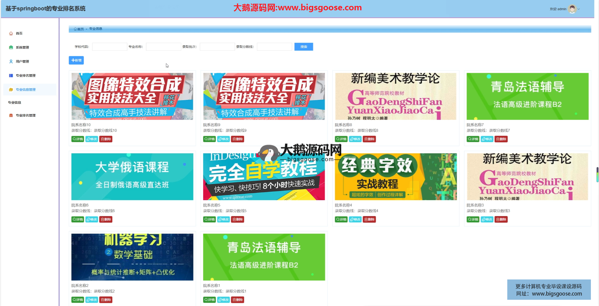 基于SpringBoot框架实现的专业排名系统,本项目适合作为计算机毕业设计、java毕业设计、微信小程序毕业设计、课程设计、大作业等参考和学习,另外本站承接计算机毕设项目开发、毕业论文辅导、论文修改、降重润色、程序讲解、答辩辅导、开题定题等毕业一条龙服务,包原创、包通过!欢迎咨询~