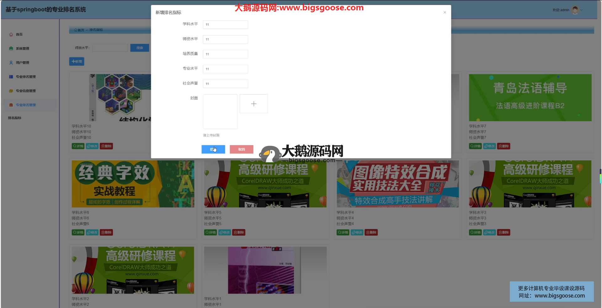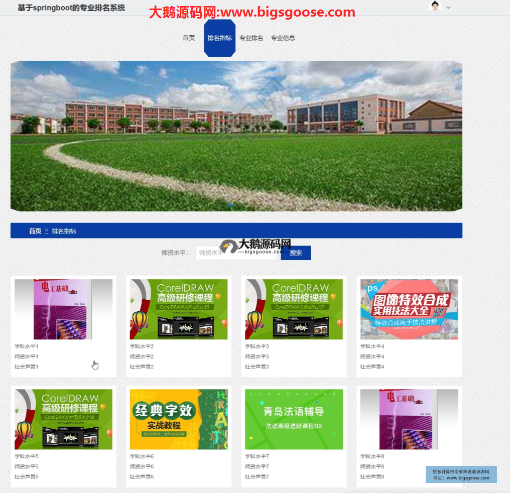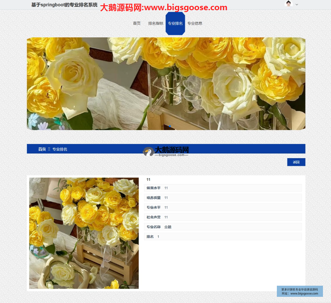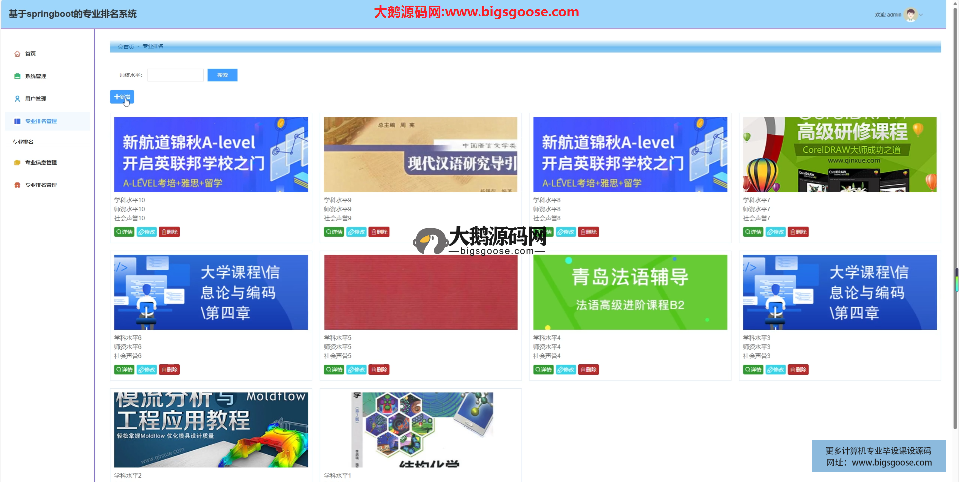 基于SpringBoot框架实现的专业排名系统,本项目适合作为计算机毕业设计、java毕业设计、微信小程序毕业设计、课程设计、大作业等参考和学习,另外本站承接计算机毕设项目开发、毕业论文辅导、论文修改、降重润色、程序讲解、答辩辅导、开题定题等毕业一条龙服务,包原创、包通过!欢迎咨询~